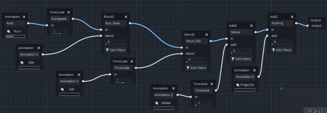 I made the axolotl's model in Blender as well as rigged, textured and animated it. I made all of its movement code in Godot. Finally I made the animation tree for it to be used in code as you can see by the image on the left.